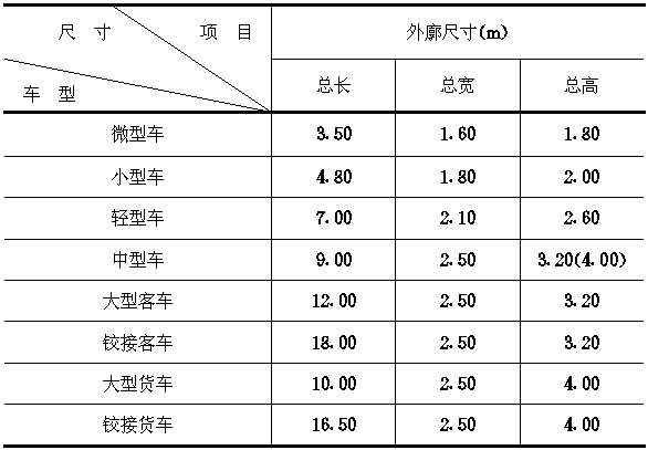 4.1.1公用汽车库中汽车设计车型的外廓尺寸可按表4.1.1的规定采用。