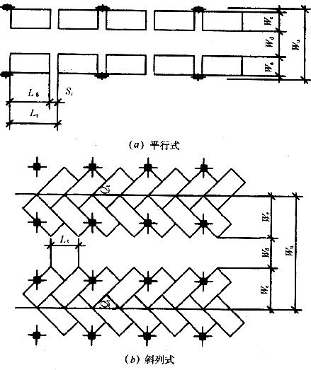 4.1.3汽车库内停车方式可采用平行式、斜列式(有倾角30°、45°、60°)和垂直式(图4.1.3),或混合采用此三种停车方式。