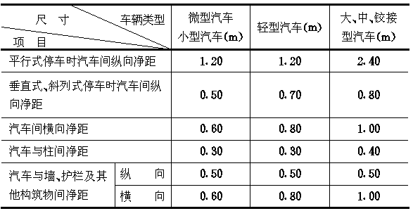 注:纵向指汽车长度方向、横向指汽车宽度方向,净距是指最近距离,当墙、柱外有突出物时,应从其凸出部分外缘算起。