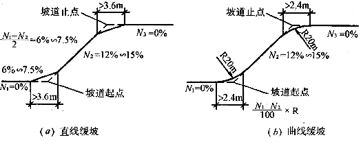 当坡道坡度大时,为了避免汽车在坡道两端擦地面设的缓和线段。